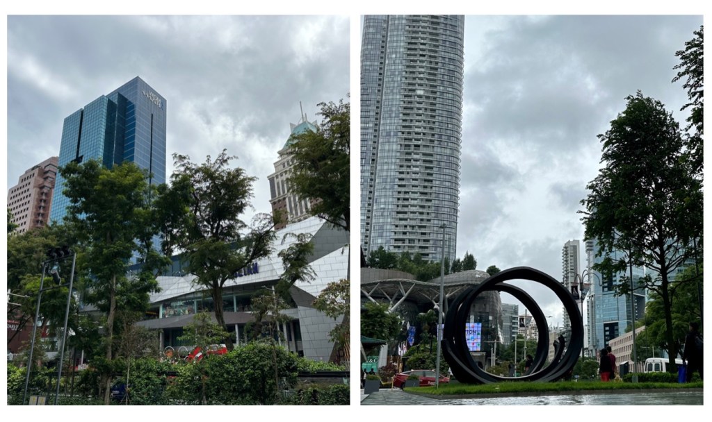 Foto links: gebouw met groene torentje is ParkSuites (onze tijdelijke stek)