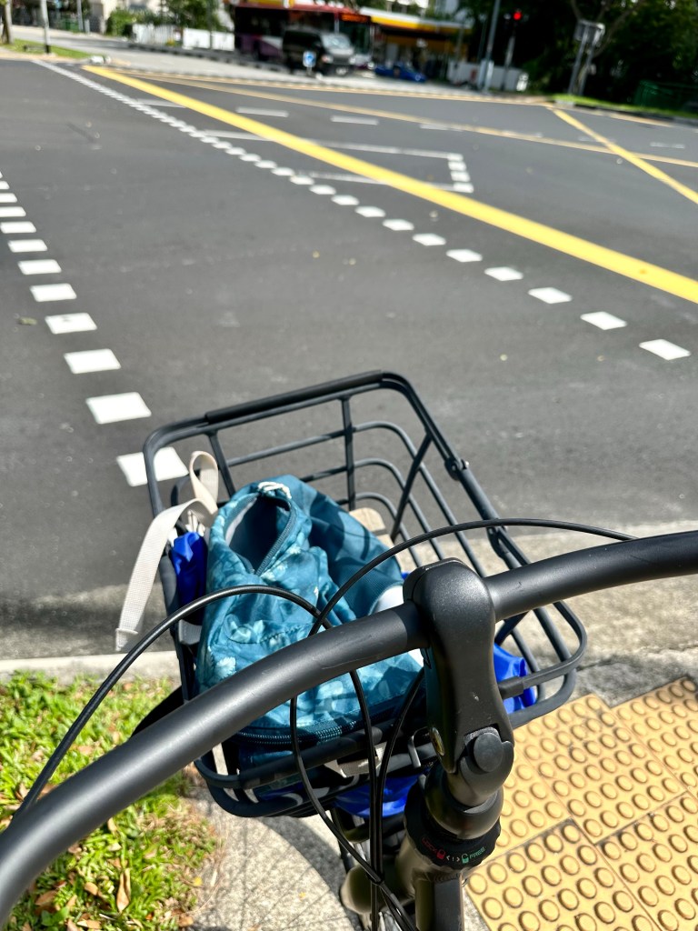 In Singapore fiets je op de stoep, tenzij je een helm draagt want dan mag je ook op de weg. Het stuk tussen Balmeg Hill en West Coast Plaza, een kleine 4 kilometer, is rustig. Ik wissel stoep af met de weg, zonder helm met pet. De stoep is hier en daar geblokkeerd en kronkelt op en af niet altijd fietshandig langs de wel aantrekkelijke rechte weg. Grote kruisingen steek ik toch maar over via de stoep. Ik heb het idee dat iedereen om me moet lachen en dat maakt me vrolijk. Ik heb de neiging om mijn bel veelvuldig te laten rinkelen en te zwaaien naar al wat voorbij komt. In no-time sta ik met mijn fiets voor West Coast Market Square waar een enorm fietsenrek staat. Reality check: zo speciaal ben ik dus niet, met die fiets.
