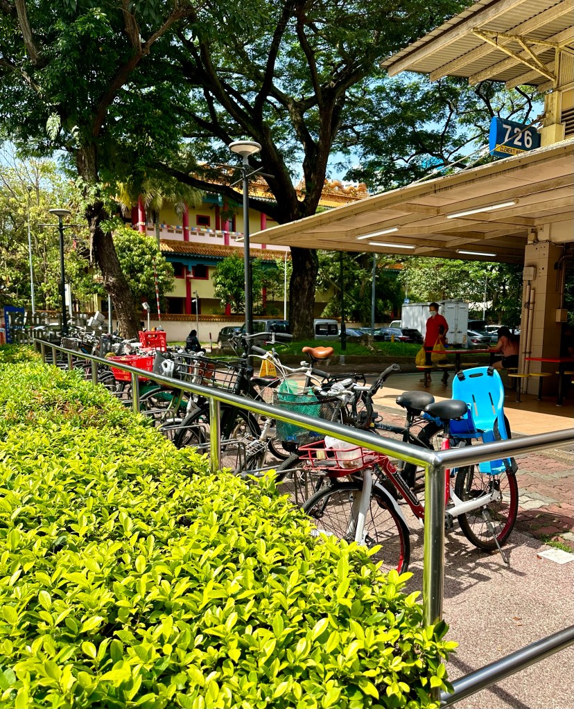 In Singapore you cycle on the sidewalk unless you are wearing a helmet because then you are allowed on the road as well. The stretch between Balmeg Hill and West Coast Plaza, about 4 kilometers, is quiet. I alternate sidewalk, without a helmet but wearing a cap, with the road. The sidewalk is blocked here and there and meanders up/down not always bike-handy along the well-convenient straight road. Major intersections I cross via the sidewalk anyway. I feel like everyone is laughing at me and that makes me cheery. I tend to ring my bell frequently and wave to all that pass by. In no time I am standing with my bike in front of West Coast Market Square where there is a huge bike rack. So apparently I am not that special with my bike.