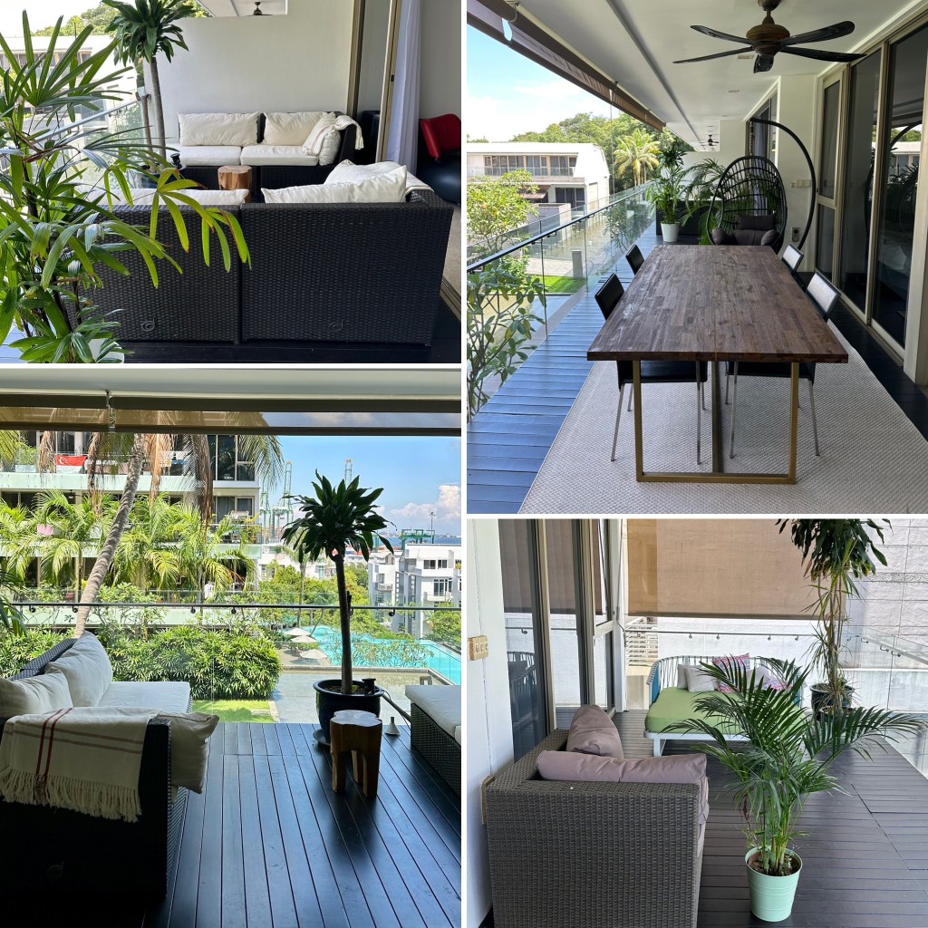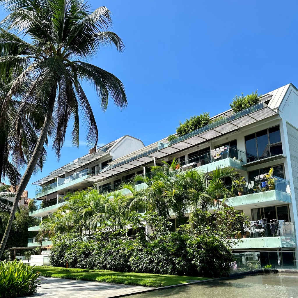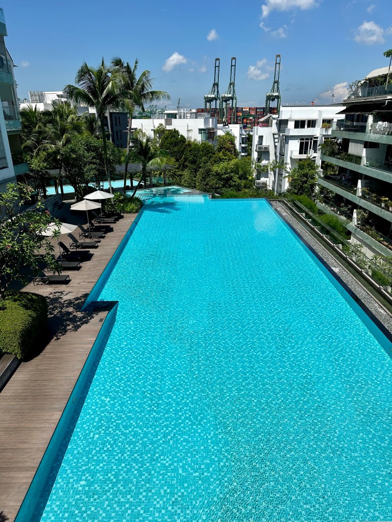 Vandaag is het, zoals elke doordeweekse dag, rustig om me heen. De circa 20 balkons waar ik zicht op heb, worden met name gebruikt om de was op te hangen en planten en meubels op te etaleren. Er zijn (Godzijdank 🙃) maar een stuk of 3 balkons die, net als door ons, intensief als buitenkamer worden gebruikt. Het zwembad is spiegelglad, er ligt geen mens in of naast en dat blijft meestal zo tot een uurtje of 16:00 uur. Soms neem ik een heerlijke duik, soms iemand anders. Onze gym is ruim en met meer dan 3 mensen tegelijk sport ik zelden. Er loopt zo nu en dan een hond met een helper (de Singaporean naam voor ‘the maid’) voorbij. En het onderhoudsteam is altijd druk met schoffelen, sproeien en snoeien.