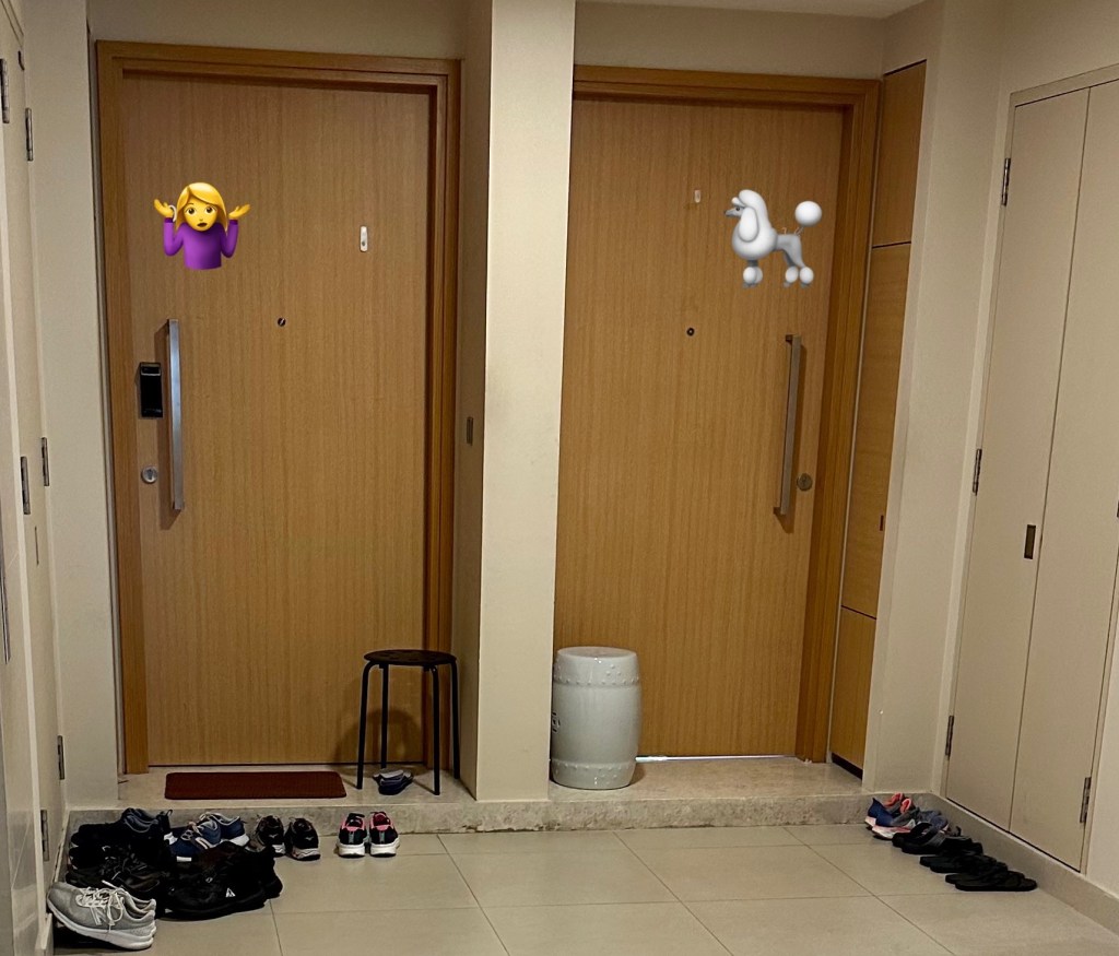 I love the peace and anonymity and often fantasize about the lives behind all those units. It’s also surprising. In such a relatively small community, living so anonymously. We share the hallway with 4 apartments, and I have only met our immediate neighbors. Well, the man, the helper, and the two toddlers, to be precise, not that I’m suggesting anything. The lady of the house does exist, I have seen and heard her from a distance. In the apartment across from ours, there are two small dogs and two ladies, one of whom I suspect is the helper. The apartment next to that is a complete mystery to me. There are at least 8 pairs of shoes outside the door, but in the four months that we have lived here, I have never seen anyone enter or leave. I don’t know the people who live above or below us either.