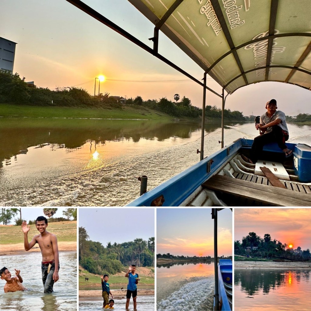 We board the hotel’s sampan at 5 p.m. for a sunset ride on the river. BEAUTIFUL! The landscape, the people, the water, and the sunset together are more than worth seeing. As for the claim that there’s nothing interesting to see/do between Phnom Penh and Siem Reap, I refer to the land of falsehood with this.