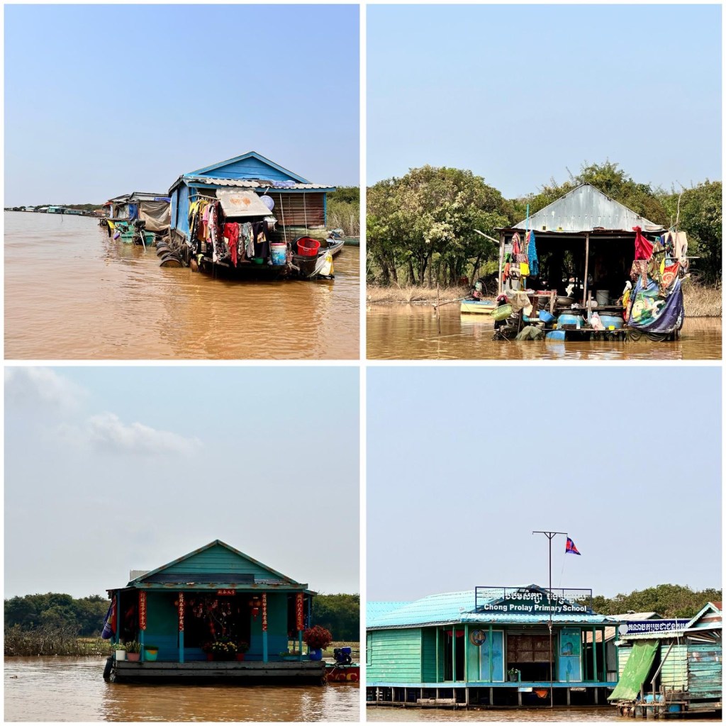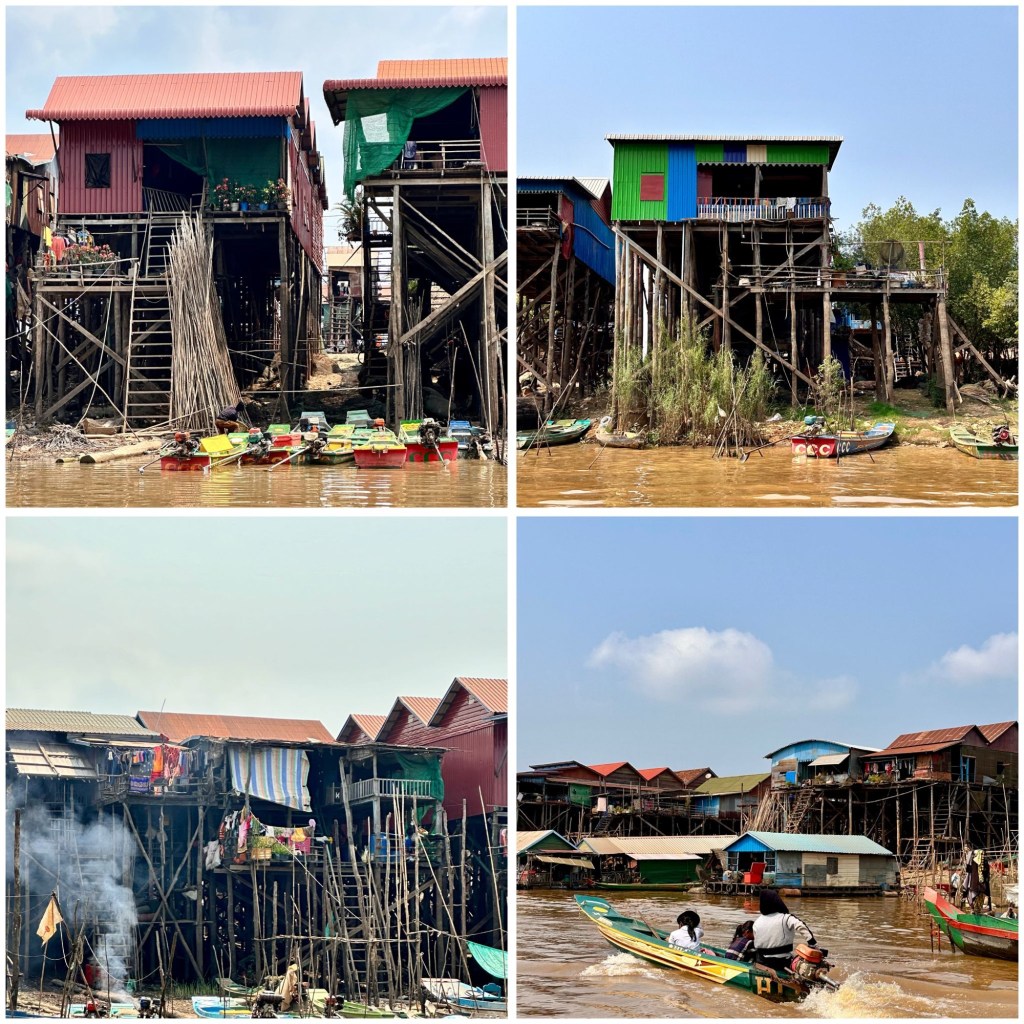 Na een uurtje buigen we van de grote weg af en worden de palen hoger en de woningen nog kleurrijker. We betalen bij een tolhuisje USD 20 pp (alles wordt in USD uitgedrukt en bij voorkeur betaald) om Kampong Khelang in te mogen rijden en daarmee is ook onze boottocht over de rivier naar het Tonle Sapmeer betaald.