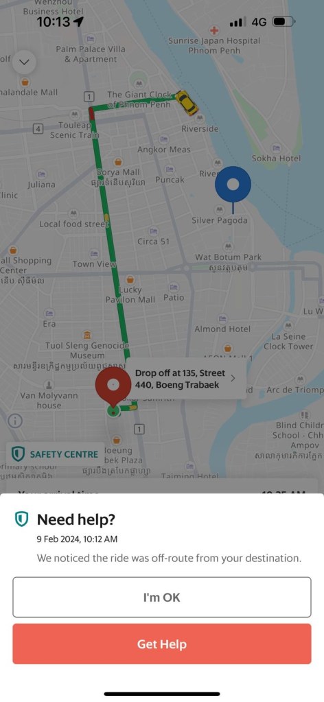 The Royal Palace is grand and beautiful from the outside. I have a smoothie on the terrace and take a taxi back to the hotel. Grab also works in Cambodia, and just as I think the driver is going the wrong way, I receive a notification from GRAB (see photo). I’ve never had such a notification before; it gives me a sense of security, and the driver lets me guide him.