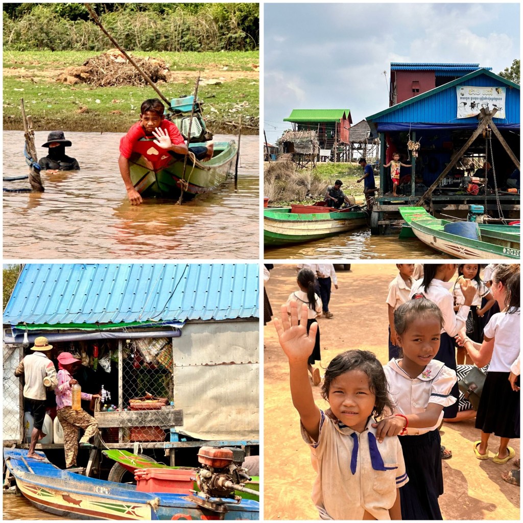 Kinderen en volwassenen zwaaien naar ons en poseren graag in of op het water voor een foto. We worden aan- en nagewezen. Hier lijken wij de bezienswaardigheid te zijn. Onze bootjongen – ouder dan 16 is hij niet – laveert onze boot tussen de drijvende huizen en mensen naar het meer en zet op het meer de motor uit. Wat een rust. Het is heerlijk op het water en de stilte maakt de beleving extra intens.
