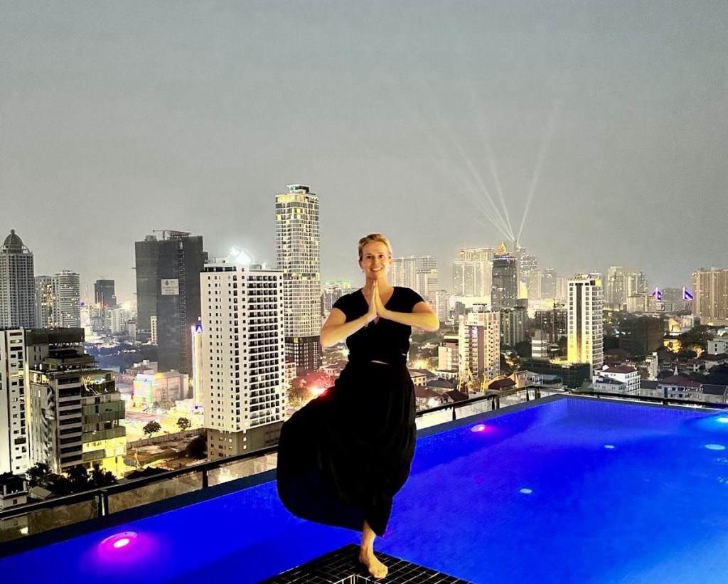 Our journey to Phnom Penh again proceeds at a snail’s pace. It seems that slow driving is the norm here too. After four hours, we arrive in the heart of Phnom Penh. Our spot is fine, and the city, as expected, is busy and chaotic. The impression I get along the way is that Phnom Penh fits into the list of Ho Chi Minh and Hanoi. There is a rooftop terrace on the 22nd floor with a swimming pool. It’s lovely, and after swimming and regaining some energy, we walk down the street in search of a restaurant.