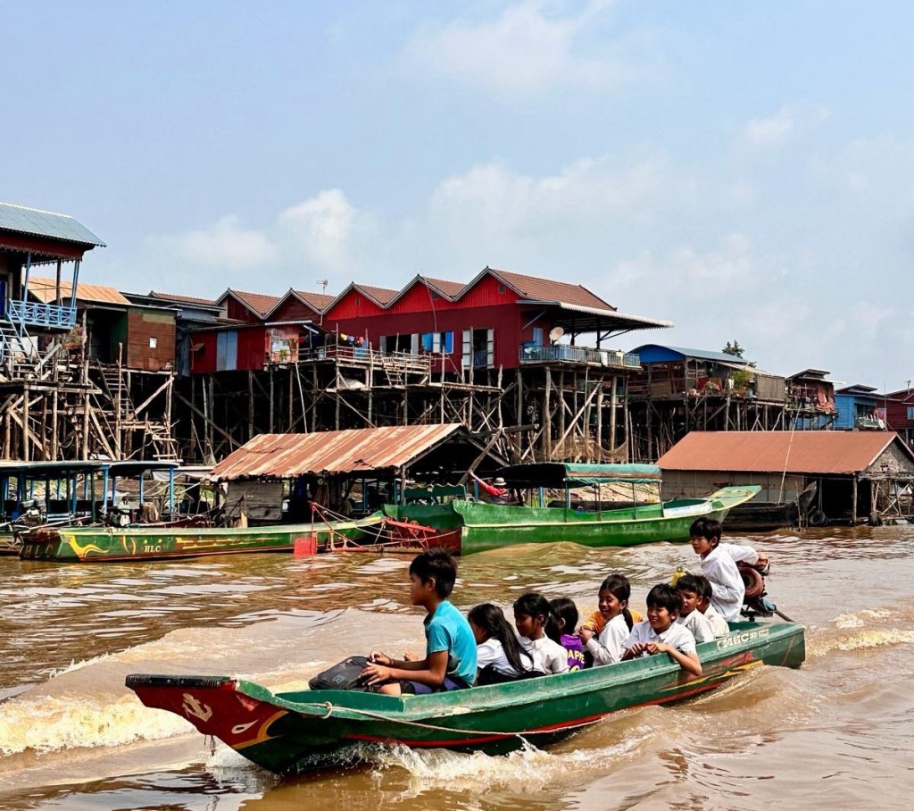Here, there are no tourist buses, nor any entertainment in the form of traditional clothing or long queues for the most picturesque photos. We marvel at the scene and continue to do so on the river. We see a floating school and beautiful houses carried by two narrow sampan boats, people fishing, children gathering plants from the river, and a bustling activity on the river, surprisingly with children also piloting boats. Two of them race past us, wearing school uniforms.