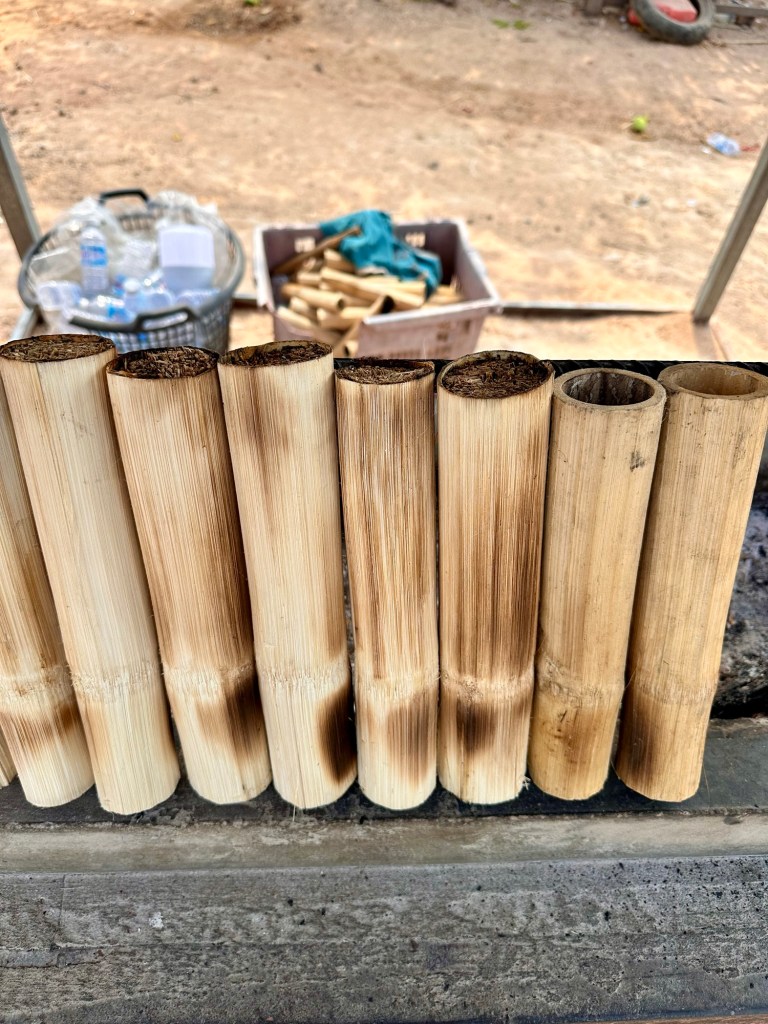 Het landschap waar we doorheen tuffen is vlak met veel landbouw. Langs de (grote) doorgaande weg is vooral lintbebouwing te zien. Paalwoningen in alle soorten (hout, golfplaten, steen) en maten en vooral in de mooiste kleuren sieren het landschap. Er staan talloze stalletjes langs de kant van de weg, allemaal uitgerust met kokers van gelijke grootte. Als we vragen wat dat is, stopt de chauffeur en trakteert ons op een koker waar sticky cocosrijst in blijkt te zitten.