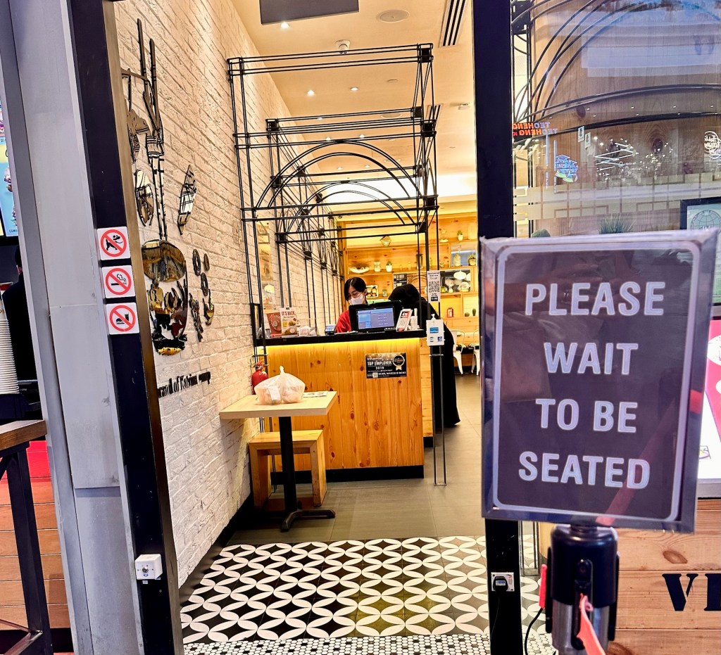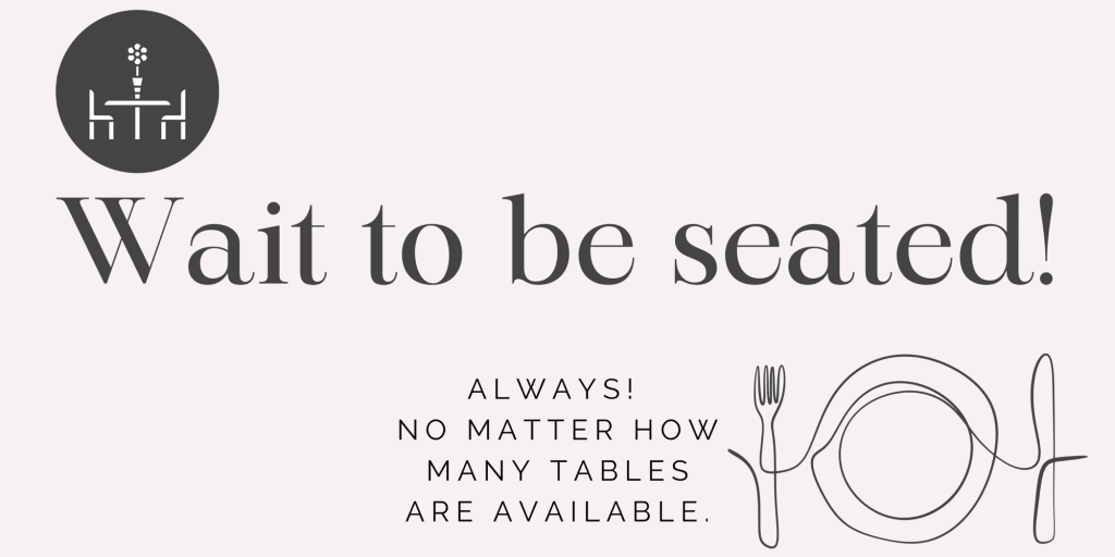 “Have reservation?” nog voordat we ons derrière op een van de vele lege stoelen neervleien, manoeuvreert de gastvrouw zich tussen ons en het beoogde tafeltje in en wijst kordaat naar de ‘host stand’ waarop een bord staat met: WAIT TO BE SEATED.