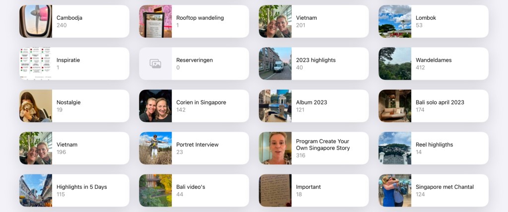 Sinds ons vertrek naar Singapore is de digitale ordening en het samenstellen van albums behoorlijk zoek. Die ruim 10.000 foto’s probeer ik te ordenen in digitale mappen. Ik heb er inmiddels meer dan 50: van AL onze trips en vakanties in Azië, wandelingen met de Dutch Walking Ladies, blogs, SingaporeandYou, bezoekers in Singapore, parken, wijken en ga zo maar door. Terugvinden wordt steeds lastiger, al weet ik nog altijd welke foto’s ik heb gemaakt. Gelukkig helpt de app me met allerlei zoekfuncties om dichter bij mijn gezochte foto te komen. Elk mapje zit vol waardevolle momenten. Vastgelegd zonder restricties, want de cloud lijkt oneindig.