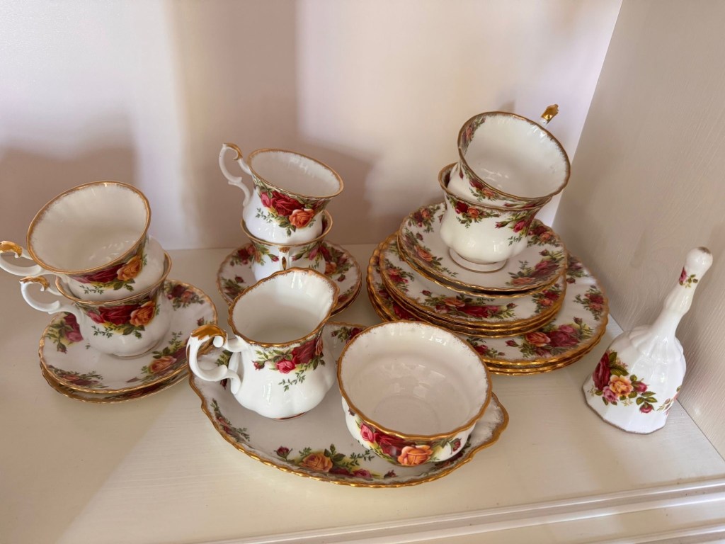 Mijn nichtje van moederskant plaatste laatst een bericht in de familie-app met de vraag wie ze blij kon maken met het gebloemde Royal Albert thee-/ontbijt servies van oma. Ze had er geen plek meer voor. JAHAAAA heel graag, reageerde ik, want de helft daarvan heb ik al en ik maak het heel graag compleet.