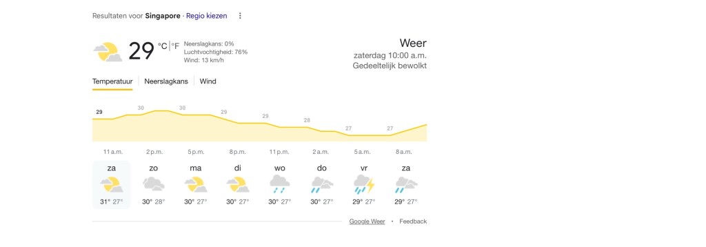 Dat weersverwachtingen überhaupt een ding zijn, zouden we haast vergeten sinds we in Singapore wonen, ware het niet dat iedere (aankomende) bezoeker ons eraan herinnert. “Ik zie dat we niet echt geluk hebben met het weer volgende week. Bewolkt en regen. Maar wel lekker warm.”