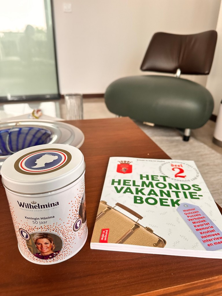 Out of the corner of my eye, I spot the tin of good old-fashioned Dutch peppermint — the kind with our royal fairytale princess smiling on the lid. Right next to it: a “Holiday Activity Book” from Helmond. Classic.