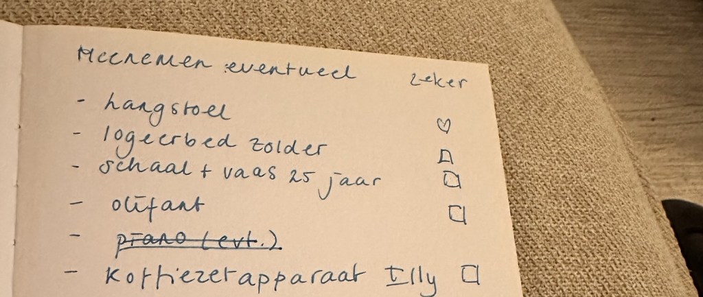 Ik vis het notitieboekje dat achter mijn bureaula is geschoven eronder vandaan en sla het open. Déjà vu. Ik stuit op een lijstje: meenemen eventueel… hangstoel, logeerbed zolder, schaal + vaas 25 jaar, olifant, koffiezetapparaat.