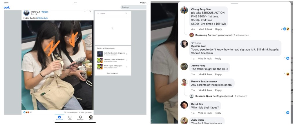 Het mag niet, overlast veroorzaken (lees meer in: Singapore regelt het wel). Maar wanneer is er sprake van overlast? Steeds vaker lees ik op socials, bij een post met foto’s van de overtreders, dat Singapore Singapore niet meer is omdat er niet genoeg wordt opgetreden. Er zijn steeds meer mensen die zich niet aan de regels houden, zo luidt die klok. Door te eten of drinken in de MRT. Door luid te telefoneren met speaker aan. Door filmpjes of muziek met geluid af te spelen. De reacties daarop lopen uiteen: stokslagen, het land uit, boetes. En een enkeling: Laat ze.