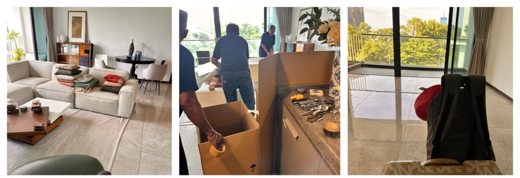Our One Pearl home is being expertly and swiftly packed by a team of six. Roetsj roetsj, rolls of tape are pressed down onto the cardboard wrapping our furniture. Piles of boxes are numbered and labelled with stickers and room codes: BR 49, short for bedroom, box number 49 🙃. How many things can one accumulate in barely three years?