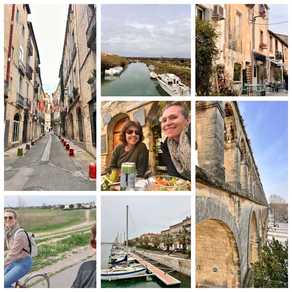 Ons doel is om de rivier te volgen tot op de landtong waar de Cathédrale de Maguelone de moeite van het bezoeken waard is. Ergens maken we een verkeerde keuze en worden halverwege vriendelijk gewaarschuwd voor de hobbelige, aardig onbegaanbare weg die we zullen opgaan als we doorgaan. We besluiten toch maar een stuk terug te fietsen. We belanden in het lieflijke plaatsje Villeneuve lès Maguelone op een schattig terrasje bij een kleine traiteur waar we van een heerlijke lunch genieten. De uitbater, een hippe grijzigerd met een goede muziek en kledingsmaak, maakt me met zijn wat belerende en weinig toegankelijke manier van communiceren bewust van mijn uber Nederlandse middelbare wijvigheid. Dat wordt nog eens benadrukt als ik weg wil fietsen zonder tas. Wat een opgetrokken wenkbrauw al niet teweegbrengt.