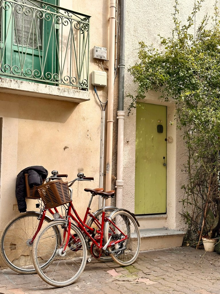 De volgende dag besluiten we na een overheerlijk gezond ontbijtje vol groene spirulina en bessen in een van de prachtige straatjes hartje Montpellier op zoek te gaan naar een fietsverhuur. De zaak die werd getipt in de online gids van onze host bleek gesloten, vrij definitief ook, maar vlakbij ons eigen plekje bleek er nog een te zitten. Geen elektrische helaas, dus dan maar op een gewone. De hippe dude die ons helpt, vertelt dat de fietsen voor 15 euro per dag te huur zijn. En hoeveel kost het voor twee dagen, vraag ik? Hij kijkt zijn baas aan die aan een fiets aan het sleutelen is en ons vraagt waar we vandaan komen. Ah Nederlanders, dan is het 35 euro voor twee dagen, antwoordt hij met een knipoog in een onmiskenbaar Amsterdams accent. We kletsen even over het Franse leven en onze ervaring in Montpellier (non existent op een paar uurtjes na) en krijgen goede tips over de route die we kunnen fietsen, die we aan het einde van de straat alweer vergeten zijn.