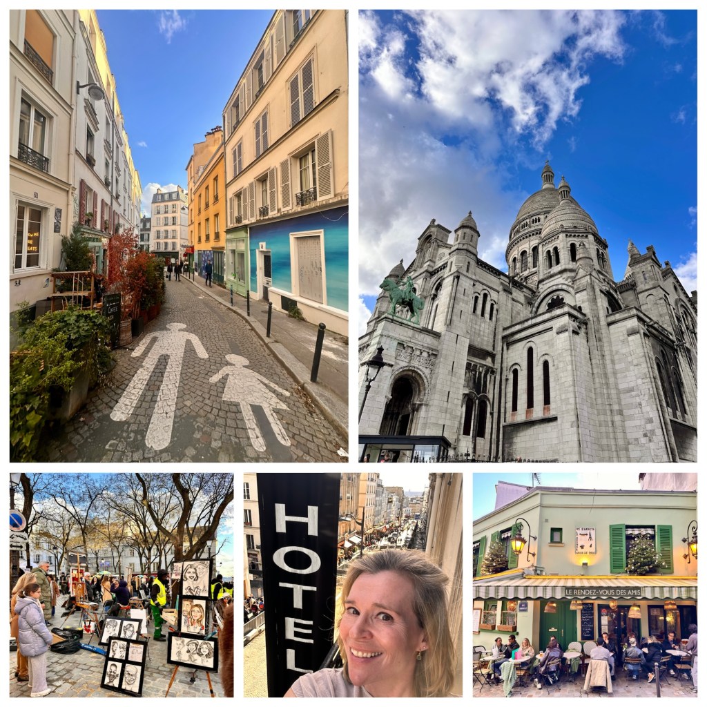 Vanaf Gare du Nord hobbelen we bepakt en bezakt naar hartje Montmartre. De zon schijnt in een helderblauwe lucht waarin nonchalant wattenwolken zijn opgelaten. Met de bloesem in de bomen lijkt de lente hier in februari al te zijn begonnen. Ons hotelletje ligt aan een hellend klinkerstraatje, het autoluwe deel van Rue Lepic. We worden hartelijk ontvangen door een enthousiaste man die ons vertelt dat we de charmantste kamer van het hotel hebben, inclusief balkon aan de Rue. Als we een paar dagen later bij diezelfde man uitchecken uit de mooiste kamer van het hotel, kijkt hij aarzelend op. Ik werk hier net, dus ik ken eerlijk gezegd nog niet alle kamers, zegt hij. Huh? Mais oui, mais non.